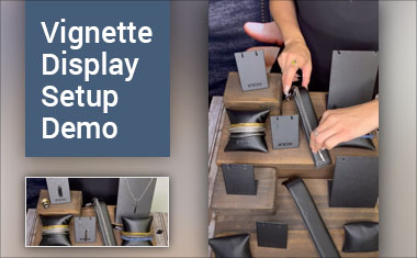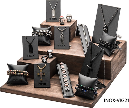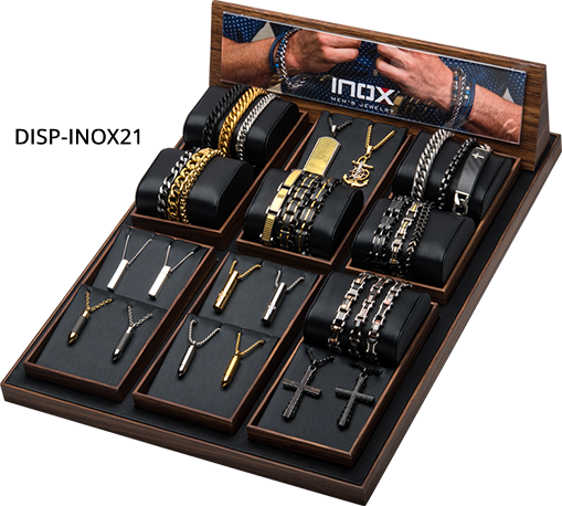 - Rich wooden finish display with Brushed black inserts. According to the lay out, it can showcase between 24 to 72 pieces of jewelry.