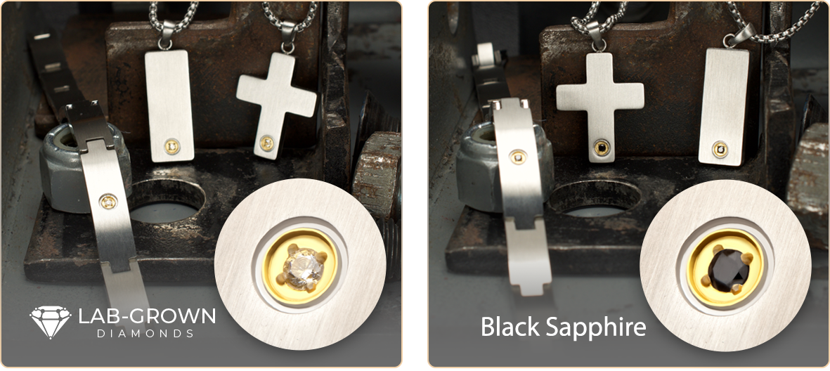 Crafted in the fiery tradition of Vulcan, the Greek god of metalwork and fire, the Vulcan collection by INOX Men's Jewelry redefines the standards of stainless steel design. Merging rugged industrial aesthetics with modern sophistication, the collection emphasizes the meticulously engineered compact size of its pendants. Despite their sleek dimensions, each piece maintains a substantial thickness that lends satisfying weight and presence. The precision-set 1.6mm gemstones—VS1 diamonds or black sapphires—each framed elegantly in 18k gold IP, elevate the clean lines and neutral tones, adding a luxurious touch to every item.